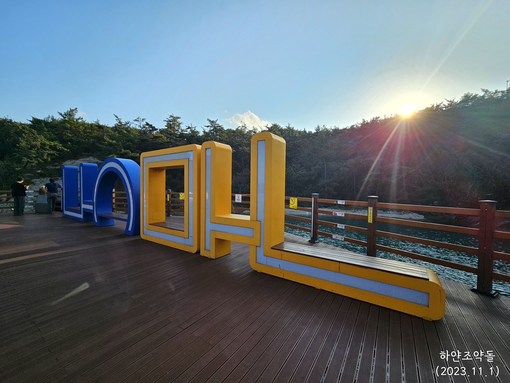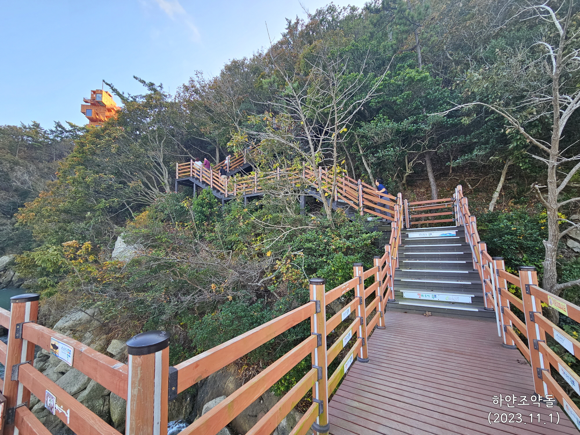 해상테크길 중간에는 유리로 된 바닥도 있었다. 철썩 소리를 내는 파도, 눈부시게 푸르른 바다, 절벽 틈에서도 꿋꿋하게 뿌리내린 나무, 기암 절벽을 보며 걷는 길이 여유로웠다. 여러 가지 분위기가 잠시 이국적인 느낌이 들게도 했다.