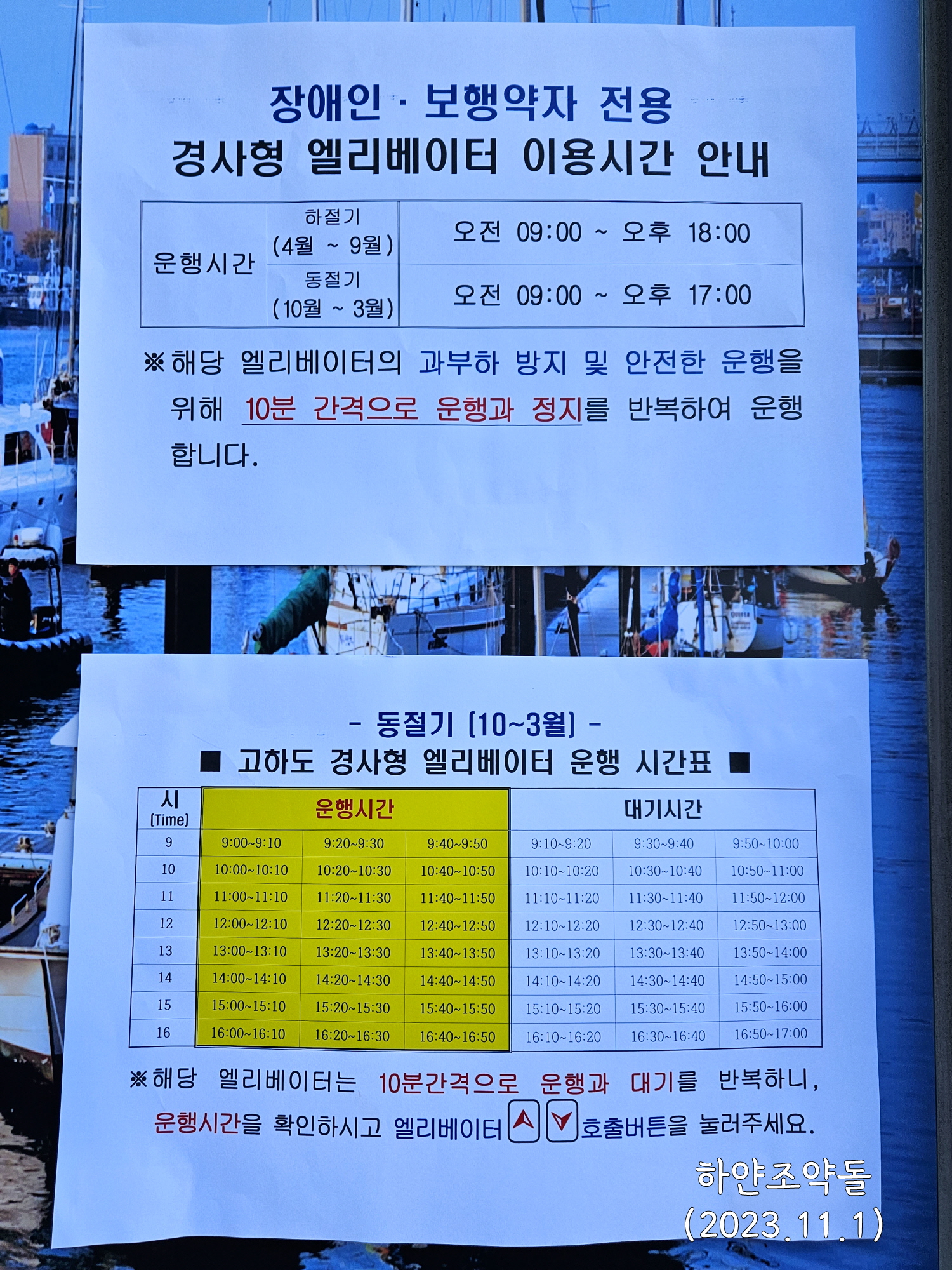 이곳을 관리하는 직원분 말로는 엘리베이터의 잔고장이 많아 경사로 왼편으로 지그재그식 계단 공사를 곧 시작한다고 한다. 하지만 '고하도승강장'으로 가려면 다시 '고하대 전망대'를 거쳐 가야 한다.