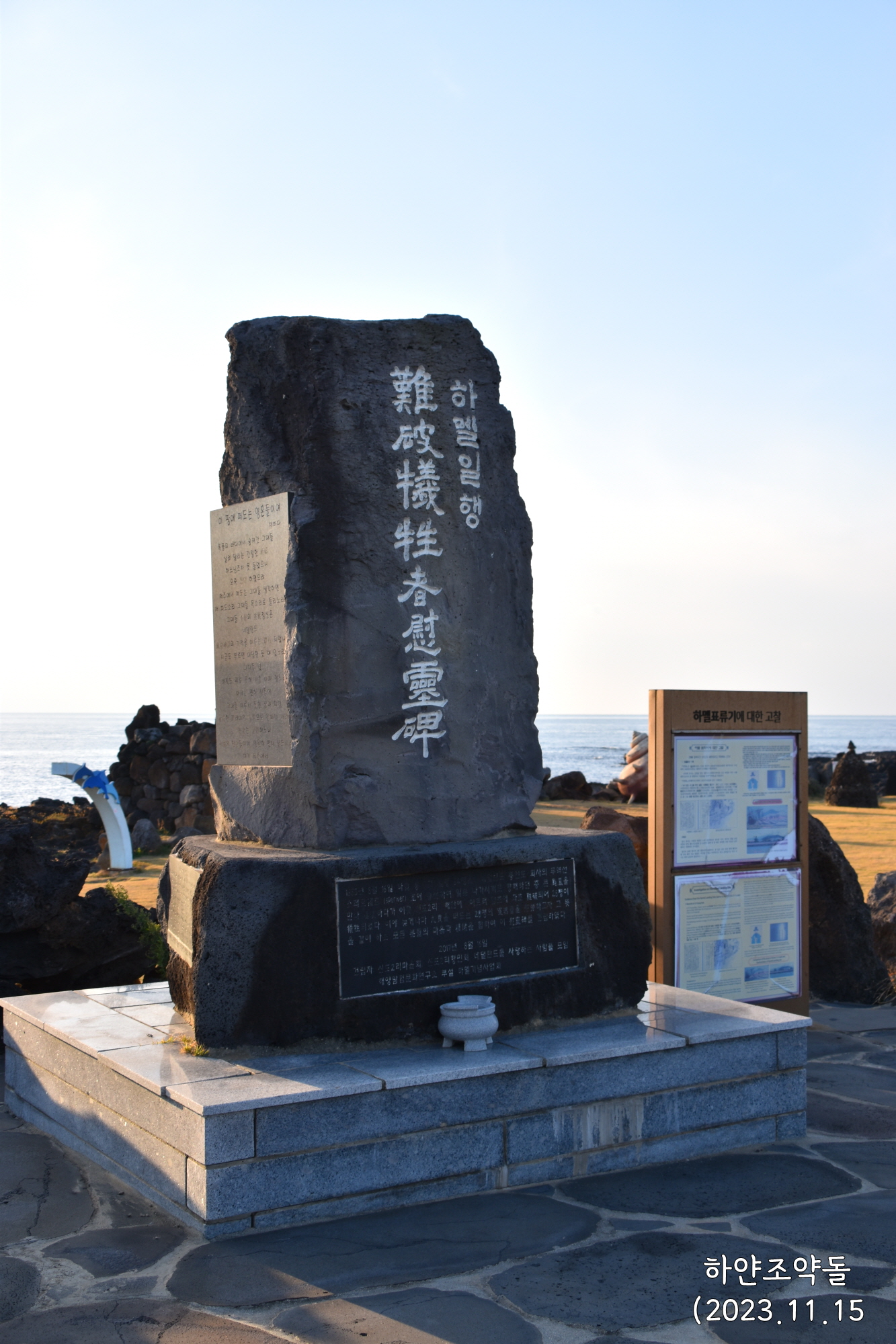 그런데 이 '뿔소라 공원' 바로 옆에 '하멜일행 난파희생자위령비'와 함께 방사탑이 건립돼 있었다. 위령비 옆에는 '하멜 표착지에 대한 고찰'이라는 내용으로 하멜이 이곳 신도리에 표착했다는 근거를 제시하고 있었다. 하멜표류기의 삽화와 이곳 신도리 해변에서 한라산을 바라보는 풍경이 비슷하다는 사진 증거를 보니 사실이겠다 싶다. 당시 표류 및 표착 과정에서 27 사람이 희생되었고 그들의 영혼을 기리는 위령비라고 한다. 그런 사연이 있었다. 하멜은 여기서 제주목사를 거쳐 전라도 병영이 있었던 내 고향 강진 병영으로 끌려갔고 그곳에서 오랫동안 감옥살이 및 노역을 하다 오랜 흉년으로 분산 배치되면서 여수로 이동한다. 그리고 거기서 네덜란드로 탈출했다. 밀린 월급을 받기 위해 쓴 "하멜표류기"에 우리나라를 곱게 묘사할 수 없었다. 아참 병영에는 한골목이라는 긴 골목이 있는데 흙돌담의 돌 모양이 우리나라 방식이 아닌 유럽의 방식이라고 한다. 노역했던 하멜 일행의 솜씨라고. 하멜 덕분에, 내 고향 병영에 기념관이, 여수 거북선대교 아래에 하멜등대가 있다.