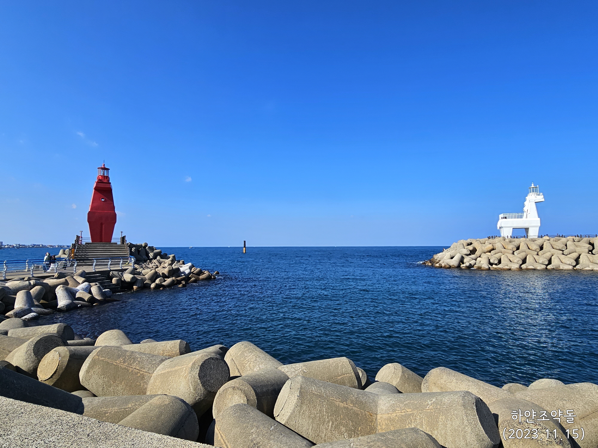 오후 5시가 되자 하늘빛이 노을로 물들기 시작했다. 도로명도 '노을해안길'이다. 그런데 신도포구를 지나자 넓은 공원에 '뿔소라' 모양의 조형물이 보이고, 바다를 조망할 수 있는 전망대가 보였다. 그리고 세 마리 돌고래가 파도를 헤엄치는 모양의 조형물이 있다. 왜 이런 조형물이 있을까 잠깐 생각하다 모슬포항까지 이동하면서 보니 '이상한 변호가 우영우가 고래를 보던 땅 매매'라는 플래카드를 보니 이곳이 촬영지인가 싶었다. 숙소에서 찾아보니 맞았다.