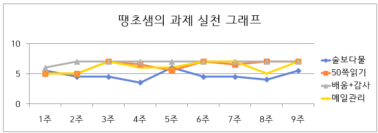 9주 동안의 실천을 꾸준히 이어갈 수 있었던 것은 무엇보다 학생들과의 약속이라는 것을 항상 잊지 않고 있었기 때문이다. 그리고 또 하나의 원동력은 최영숙 선생님과 강성진 학생의 애정 어린 응원과 조언이었다. 최영숙 선생님의 특유의 자상함과 따뜻한 응원의 말씀으로, 강성진 학생은 실천 기록을 꼼꼼하게 살펴서 칭찬은 물론, 나에게 필요한 따끔한 조언을 세심하게 전해 주었다. 두 멘토님의 응원으로 9주간의 길고도 짧았던 도전을 마무리할 수 있었다.