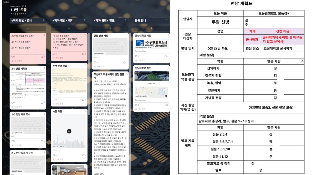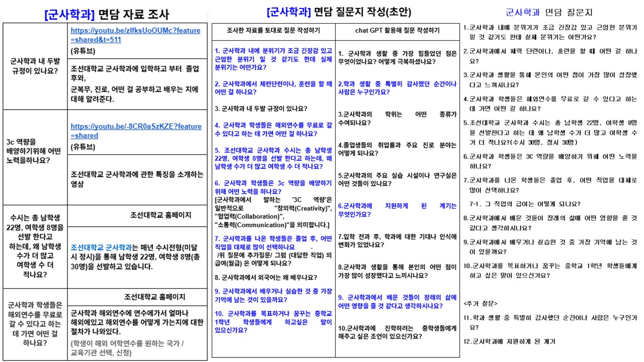 이후 질문지 작성 과정은 국어과와 연계하여 진행되었다. '내용 요약하기'와 '정보 전달하는 글쓰기' 성취 기준을 연결하여 학생들이 단순히 궁금증을 나열하는 것을 넘어, 자료를 통해 학과의 특성을 파악하고 질문을 체계화하는 능력을 키우도록 지도했다. 학생들은 탐방할 학과 정보를 수집하여 학과의 특성을 파악한 뒤, 10개 정도의 질문지를 만들었다. 이때 챗GPT와 같은 AI 도구를 활용하여 질문을 만들어 본 후, 가장 적합한 질문 10개를 선정하도록 안내했다. 질문지 구성은 첫 번째 질문은 면담자와 관련한 내용으로, 마지막 질문은 해당 학과에 관심 있는 학생들에게 조언을 구하는 것으로 통일하여 면담의 예의와 실질적인 정보 습득을 모두 고려했다. 탐방 준비부터 실제 탐방, 보고서 작성까지 모든 활동 안내는 구글 클래스룸과 패들렛을 통해 이루어졌다.