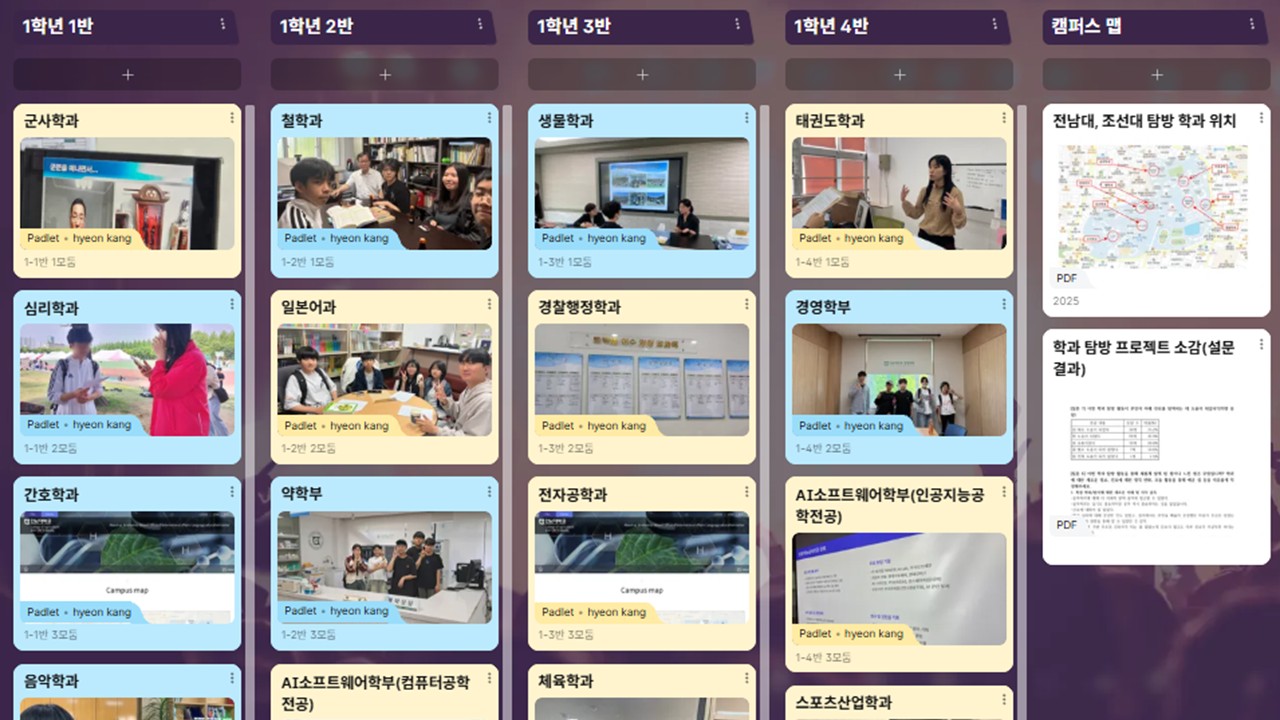 프로젝트에 대한 심화 성찰을 위해 '패들렛'을 학과 탐방 공유 사이트로 운영했다. 학생들이 탐방 내용에 대한 자세한 정보를 공유하고, 자유롭게 의견을 나누며, 프로젝트 전반에 대한 성찰의 시간을 가질 수 있도록 독려했다. 이러한 과정은 학생들이 프로젝트의 의미를 내면화하고, 다음 활동을 위한 발판을 마련하는 데 기여했다.