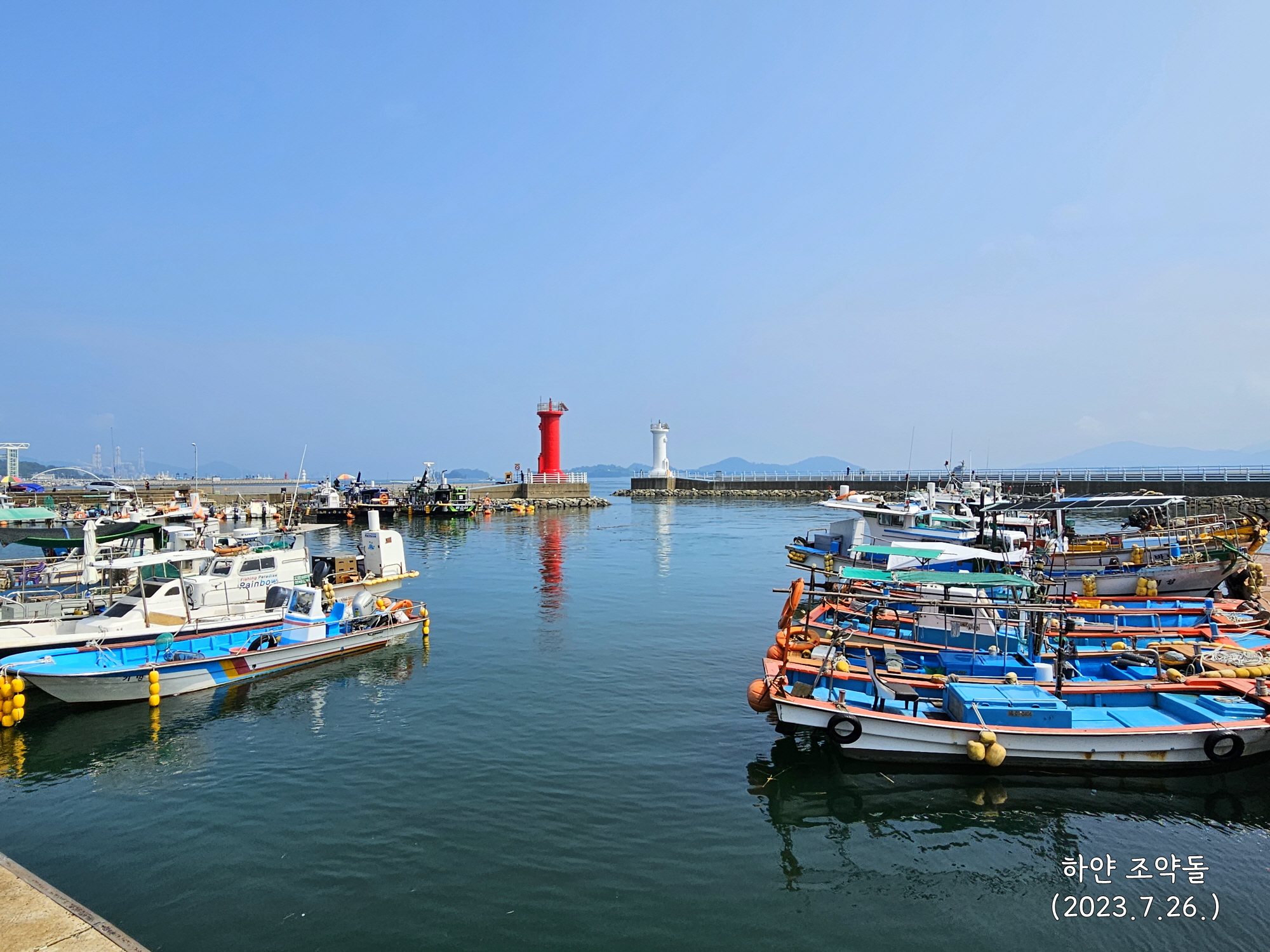 이중 사천대교 가기 전에 '대포항'을 만난다. 이곳은 사천의 대표 어종(노산공원 물고기 동상에도 등장하는)이기도 한 '전어'가 유명한 곳이다. 7월인데도 수조에 전어가 그득하고 관광객들도 제법 많았다. 이곳의 명물은 남쪽 방파제 끝의 '그리움이 물들면' 여인상이다. 답사를 가기 전부터 '그리움이 물들면' 여인상이 여수 장도의 예술 작품과도 비슷하다는 느낌을 받았는데 살펴보니 같은 '최병수' 작가 님의 작품이었다. 여수 장도와 차이점이라면 여인상의 이마에 별과 달의 차이. 그런데 이곳 대포항의 여인상은 날씨나 시간의 변화에 따라 다양한 마음을 담을 수 있다는 게 차이점으로 느껴졌다.