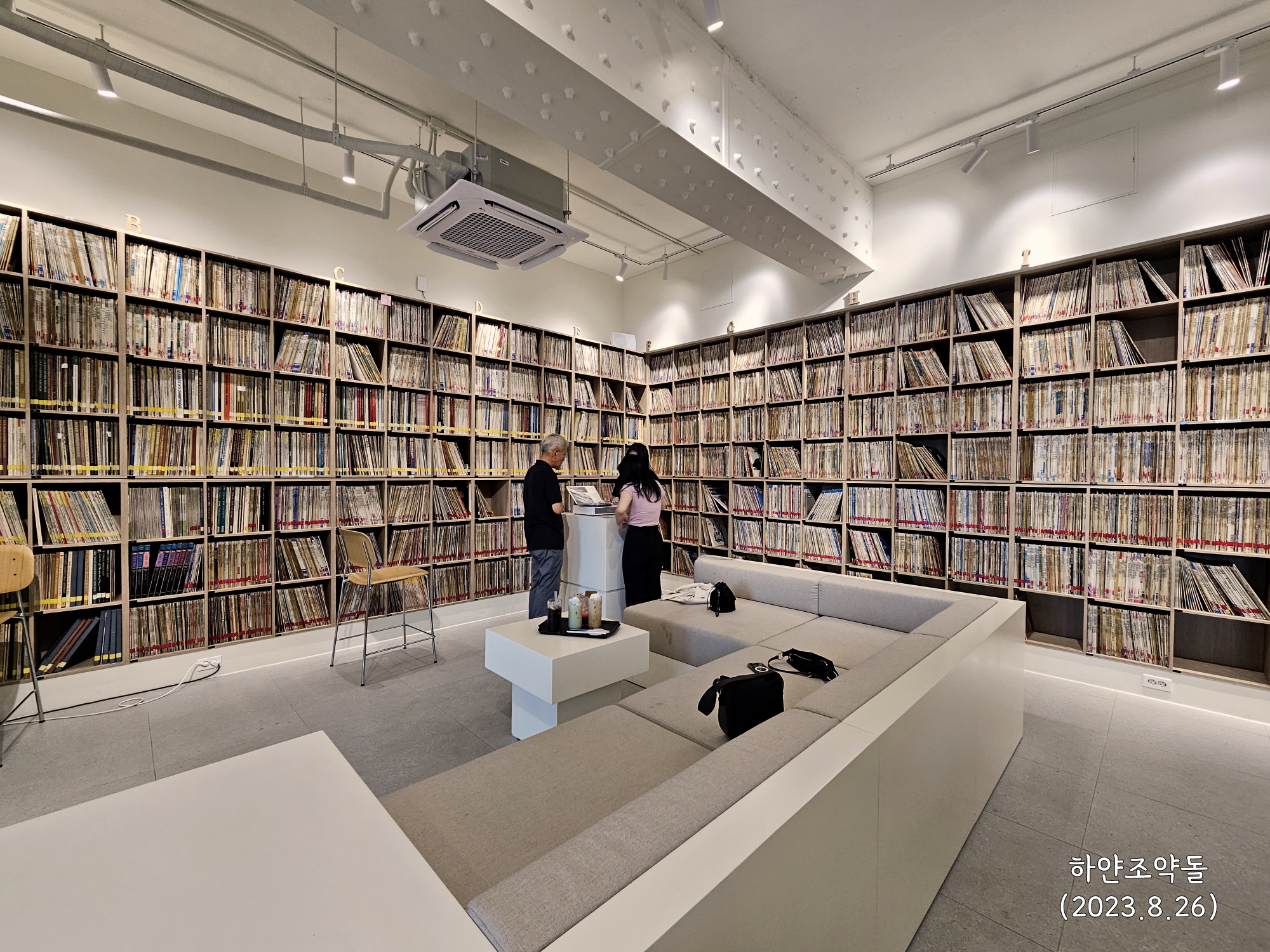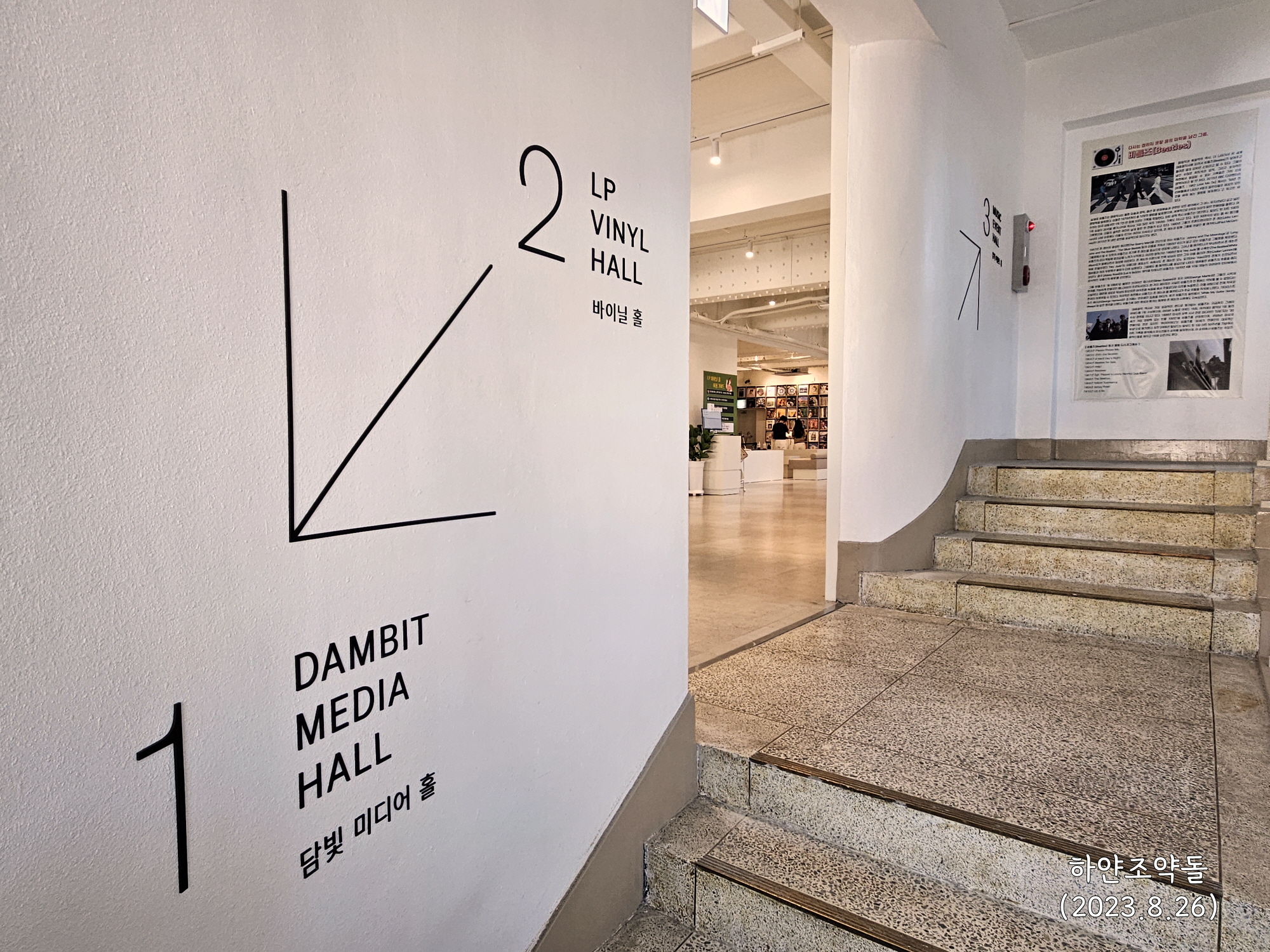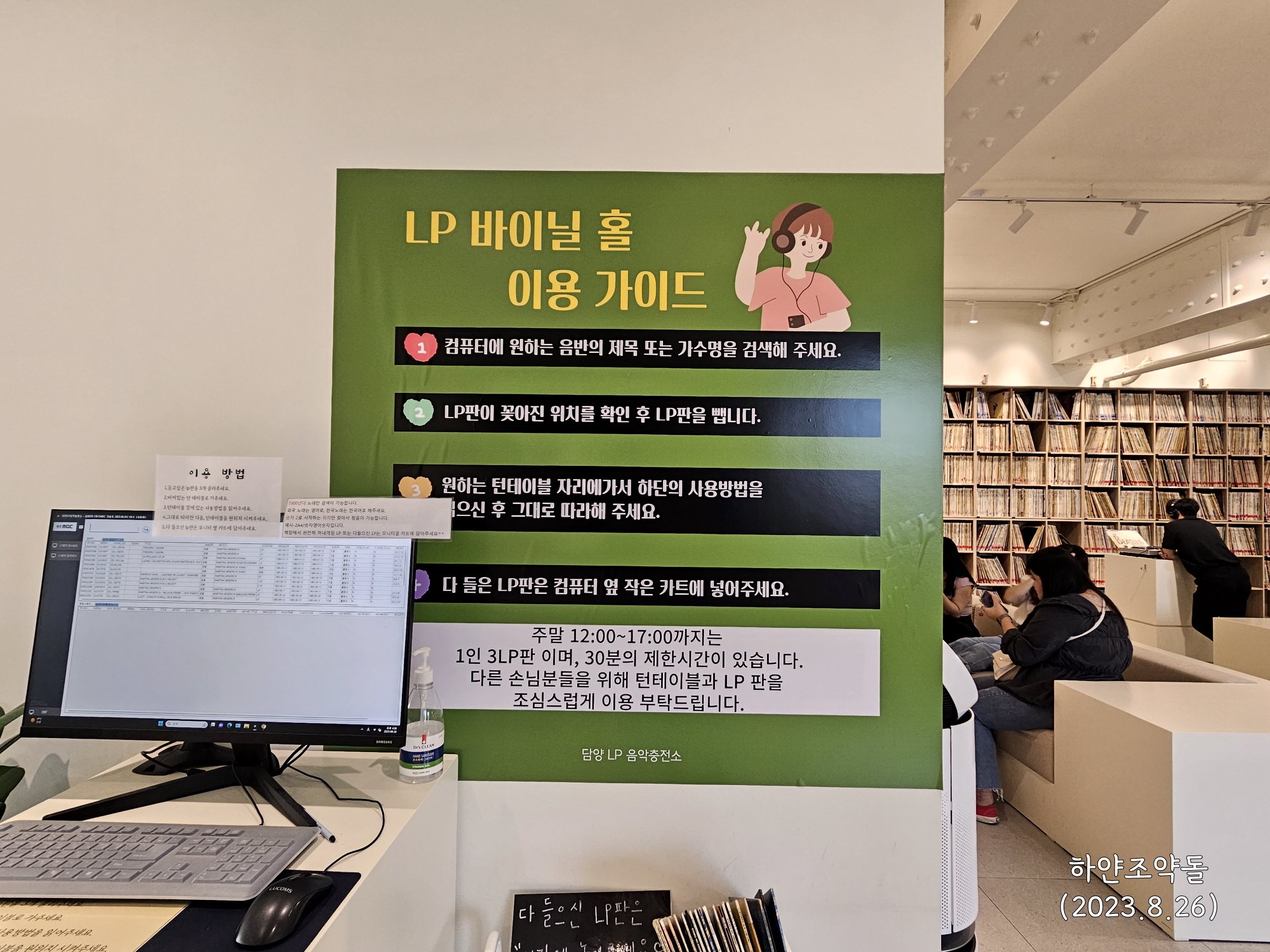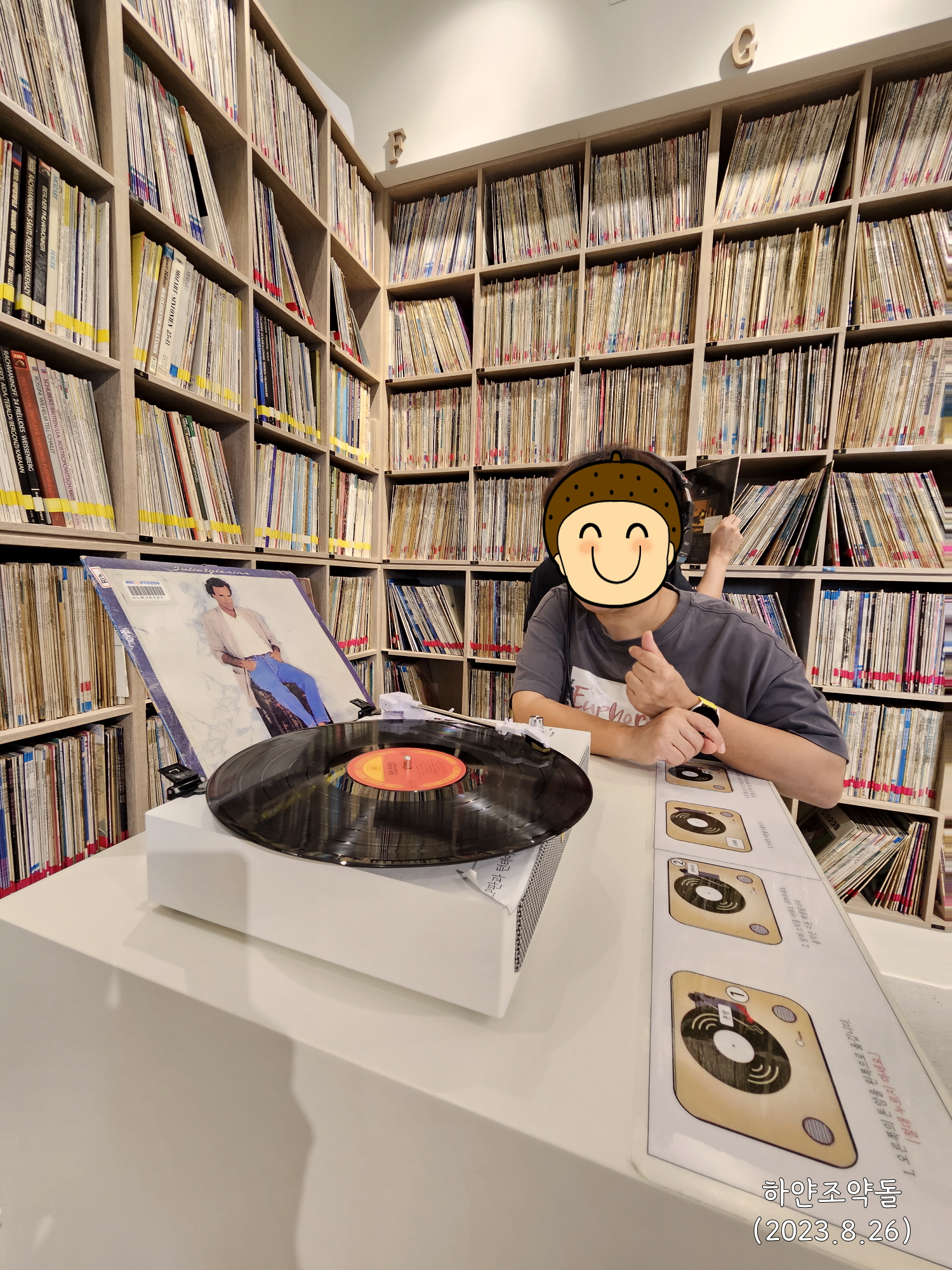 턴테이블이 4개 있는데 한 대가 고장 나 줄이 제법 길었다. LP3장을 30분 이내에 감상하자는 안내가 적혀 있었지만 음악에 빠져서인지 잘 지켜지지 않았다. 집에도 턴테이블이 있지만 LP가 몇 장 되지 않아 가끔 들을 뿐이다. 하지만 여기는 LP판이 다양해 더 들어보고 싶었다. LP판에 카트리지가 닿을 때 나는 잡은 같은(또는 튀는) 소리가 정겹다.