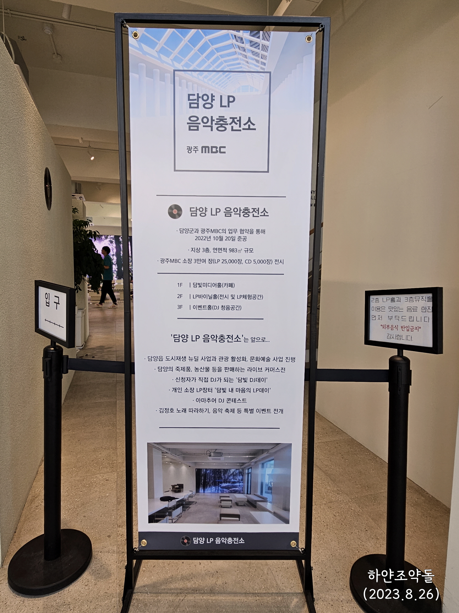 음악을 들으며 리플릿을 보니, 담양읍 도시재생 뉴딜 사업으로 광주MBC와 담양군이 협약을 맺어 작년(2022)부터 운영하고 있다고 한다. 담양군은 공간을 제공하고, 운영은 광주 MBC에서 하는 것 같다. 카페 영수증에도 광주엠비시라고 적혀있고, 2층의 LP도 광주 MBC에서 관리하고 있었다. 3층 디제잉도 광주 MBC 아나운서가 진행하고.